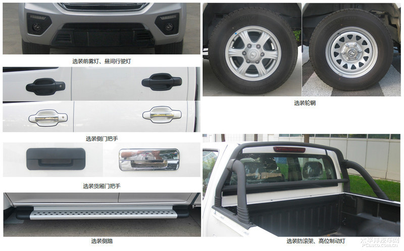新汽车全系列标准配置BOSCHABS,可选择配备包含前雾灯、日间行车灯、边门门把、货箱门拉手、侧踏、防滚架、上位制动系统灯、轮圈。