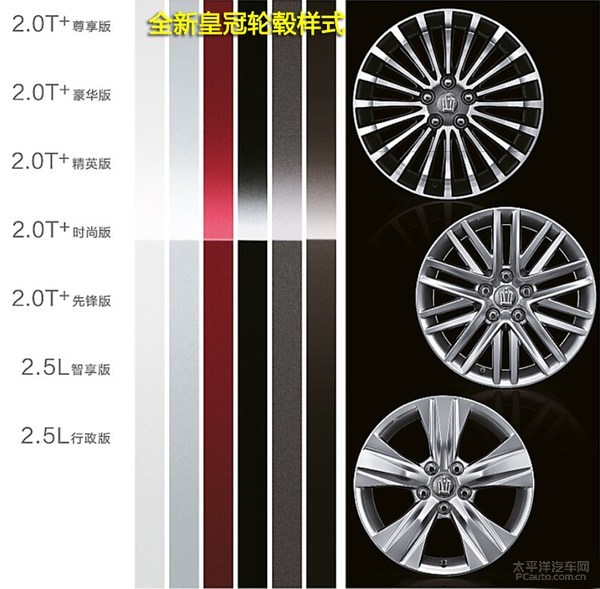 全新皇冠有5种颜色可选,晶石真珠乳白色、银金属光泽、深红色黑云母金属光泽、灰黑色、深灰色黑云母金属光泽、深棕黑云母金属光泽车体色调一样展示出不输旧款车系的庄重神圣。新君越有三种铝合金轮毂,一种是18英寸20辐款式,尽展奢华空气,一种是17英寸10辐款式,也有另一种是同是17英寸的5辐款式。