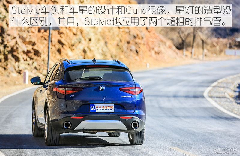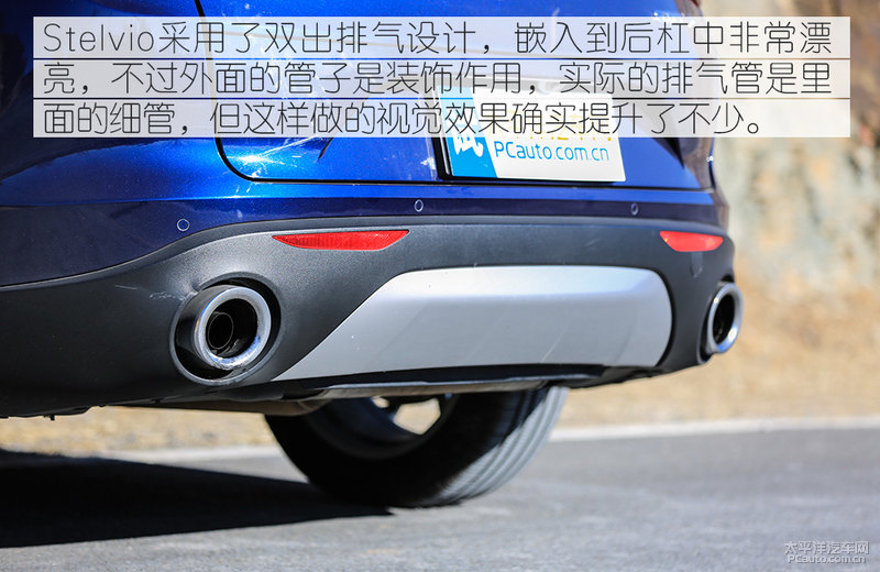 Stelvio车前和后尾的设计方案和Gulia很像,后尾灯的造型设计没有什么差别,而且,Stelvio也运用了2个超粗的排汽管,自然,2.0T的柴油发动机不需要那么粗的排气管,因此,它实际上是个装饰设计,真实的细管是套在里面的。可是,那样包裝一下的确提高了气魄,响声并不大,但很超好听。